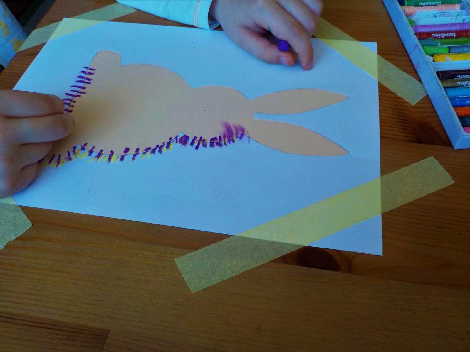 Na kolorową kartkę przykładamy szablon królika, następnie całość przyklejamy taśmą malarską do stołu. Nie róbcie tak jak my tylko brzegi, bo kartka pod spodem się przesuwa przy rozcieraniu. Lepiej przykleić całe boki. Kiedy już kartka będzie przymocowana do stołu malujemy kreski na szablonie, ale tak aby wychodziły na kolorową kartkę. Fajnie jest wybrać różne kolory, będzie ciekawszy efekt. Kiedy wszystko zakreskowane przystępujemy do rozcierania. Pisaliście do mnie ostatnio po zorzy, że nie dało się rozcierać. Pewnie wszystko zależy od pasteli. Nie mam porównania z innymi markami, bo od zawsze używamy Bambino i one się pięknie rozcierają. Oczywiście w trakcie rozcierania, jak widac że gdzieś jeszcze brakuje można domalować i na nowo rozetrzeć kreseczki. Kiedy cały królik będzie roztarty, ściągamy szablon, doklejamy pompon i jeśli chcecie piszecie życzenia. Prosta praca a ciekawy efekt. My pierwszy raz rozbieraliśmy do środka pastele, a pomysł podpatrzyłam na pintrerest tylko nie zapisałam pina:/