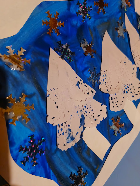 Klara niebieską i złotą farbą za pomocą gąbki na patyczku zrobiła tło naszego obrazka. Ja pocięłam jej trójkąty z serwetek i nóżki z kartek. Następnie wycięłam ramkę, którą nakleiłyśmy na nasze tło. Później Klara doklejała choinki. Dwa trójkąty i prostokąt i wyszła nam zimowa choinka. Na koniec doszły gwiazdki i praca gotowa.