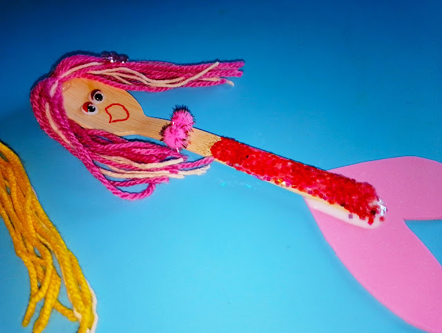 Wycięłam Klarze ogon z pianki, zrobiłam włosy. Klara nakleiła ruchome oczka, zrobiła usta czerwonym pisakiem. Następnie rączkę łyżeczki pokryła klejem introligatorskim i posypała brokatem. Dokleiła pomponiki i ogon i gotowe:)