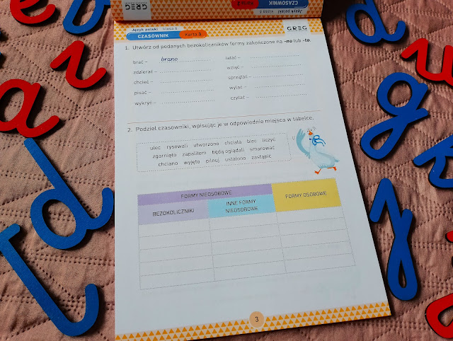 Książka „Język polski. Karty pracy w szkole i w domu”, Wydawnictwa Greg jest wydana w bardzo przyjaznej dla dziecka formie. Kolorowe rysunki, tabele – w spokojnej tonacji, które nie będą rozpraszać wzroku. Przejrzyste, czytelne zadania, jasne polecenia, to wszystko sprawia, że uczeń z powodzeniem może pracować samodzielnie.