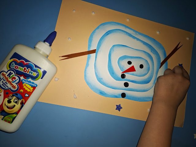Klara namalowała niekształtne okręgi o rożnej wielkości. Wycięłam jej nos i węgielki oraz ręce bałwana z papieru kolorowego (samoprzylepny). Klara malowała boki swoich okręgów pastelami, następnie rozcierała to chusteczką. Kolejnym etapem było wycięcie okręgów i sklejenie za pomocą dwustronnej pianki . Dzięki czemu mamy efekt 3d. Dodatkowo doszły gwiazdki zrobione dziurkaczem i ciekawa praca plastyczna gotowa!